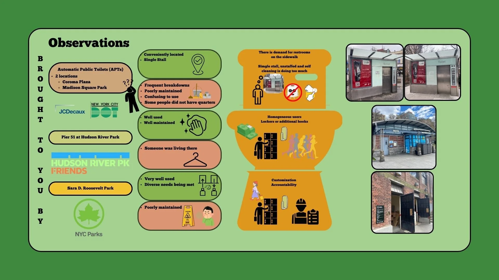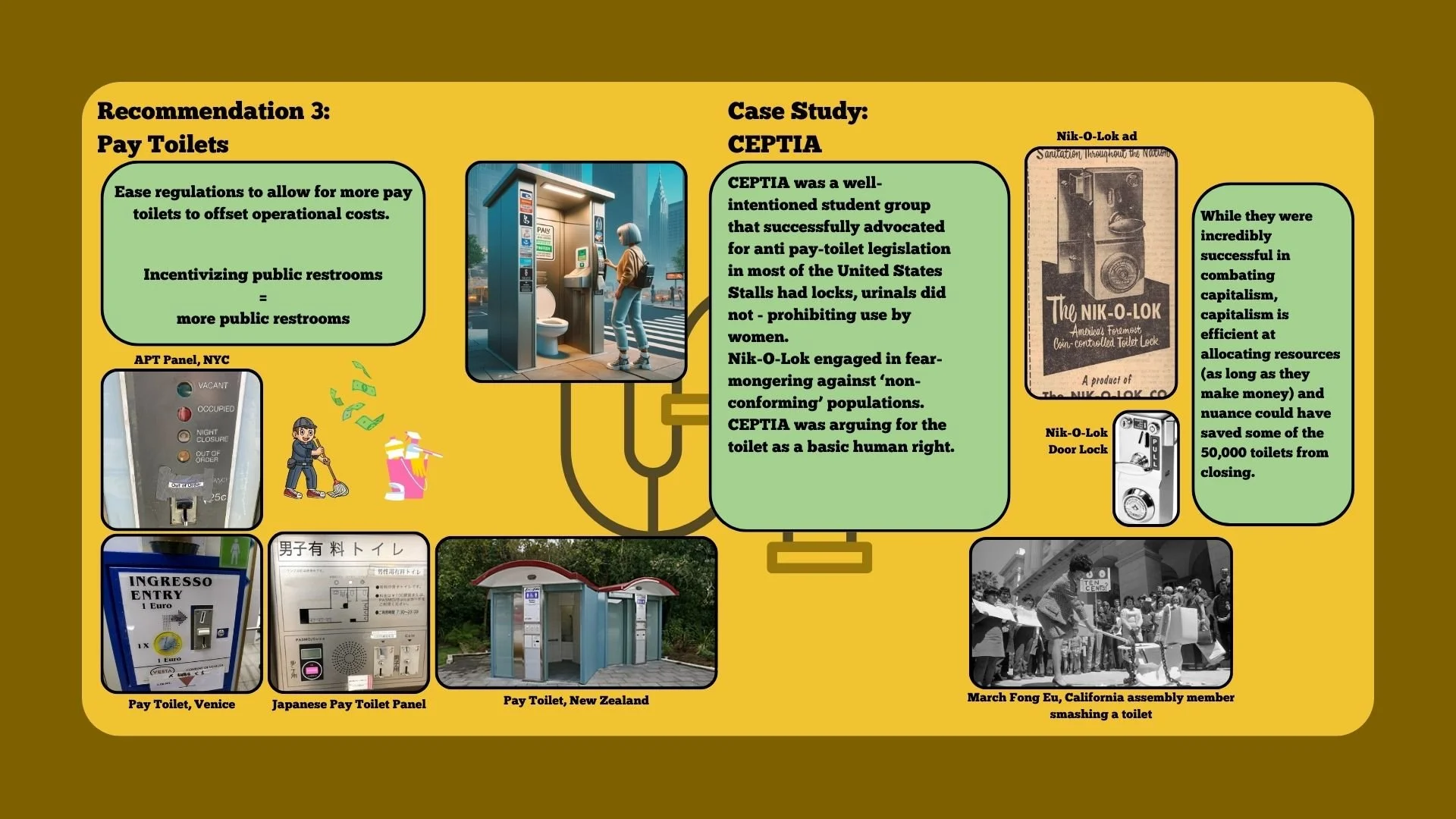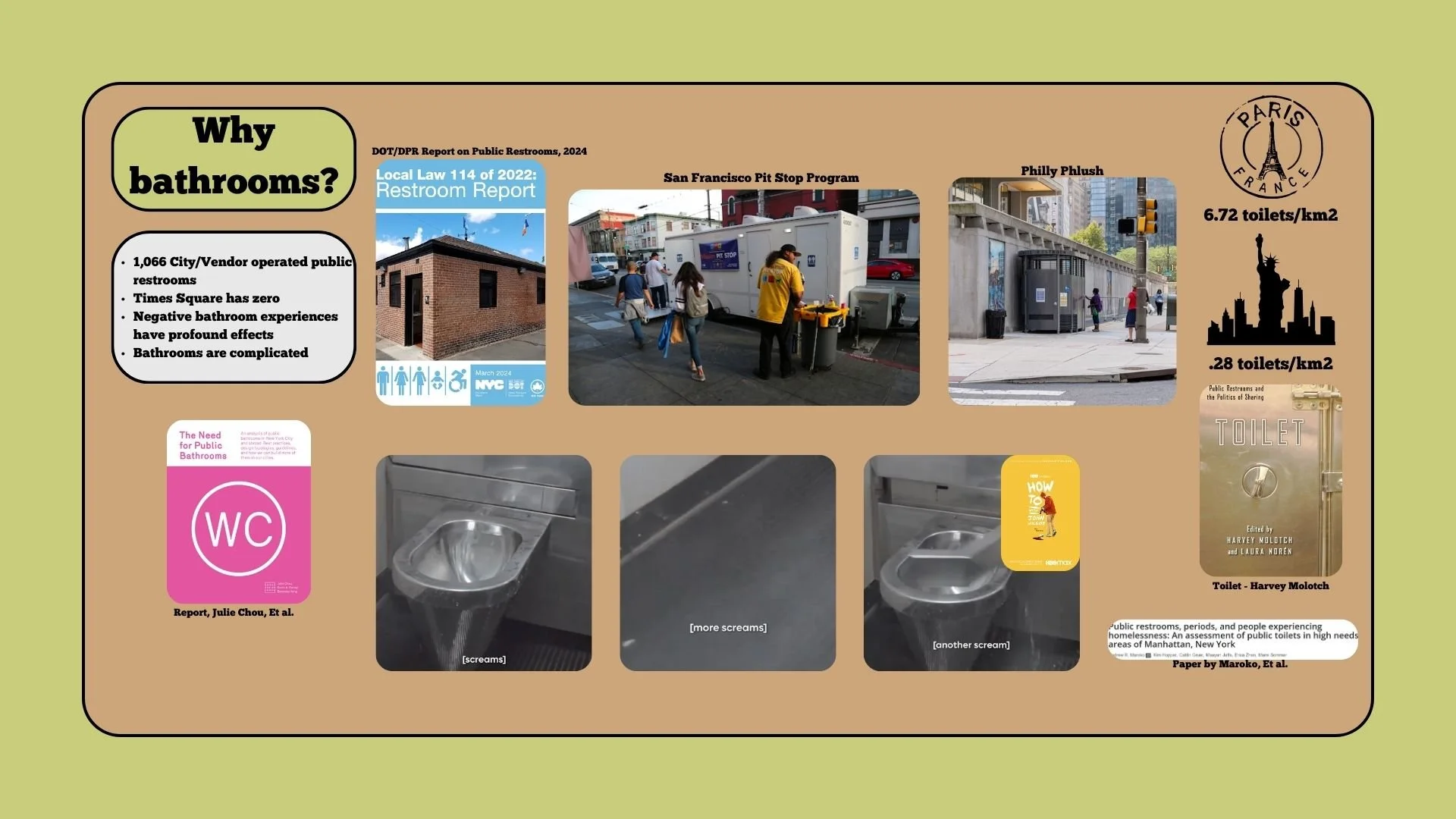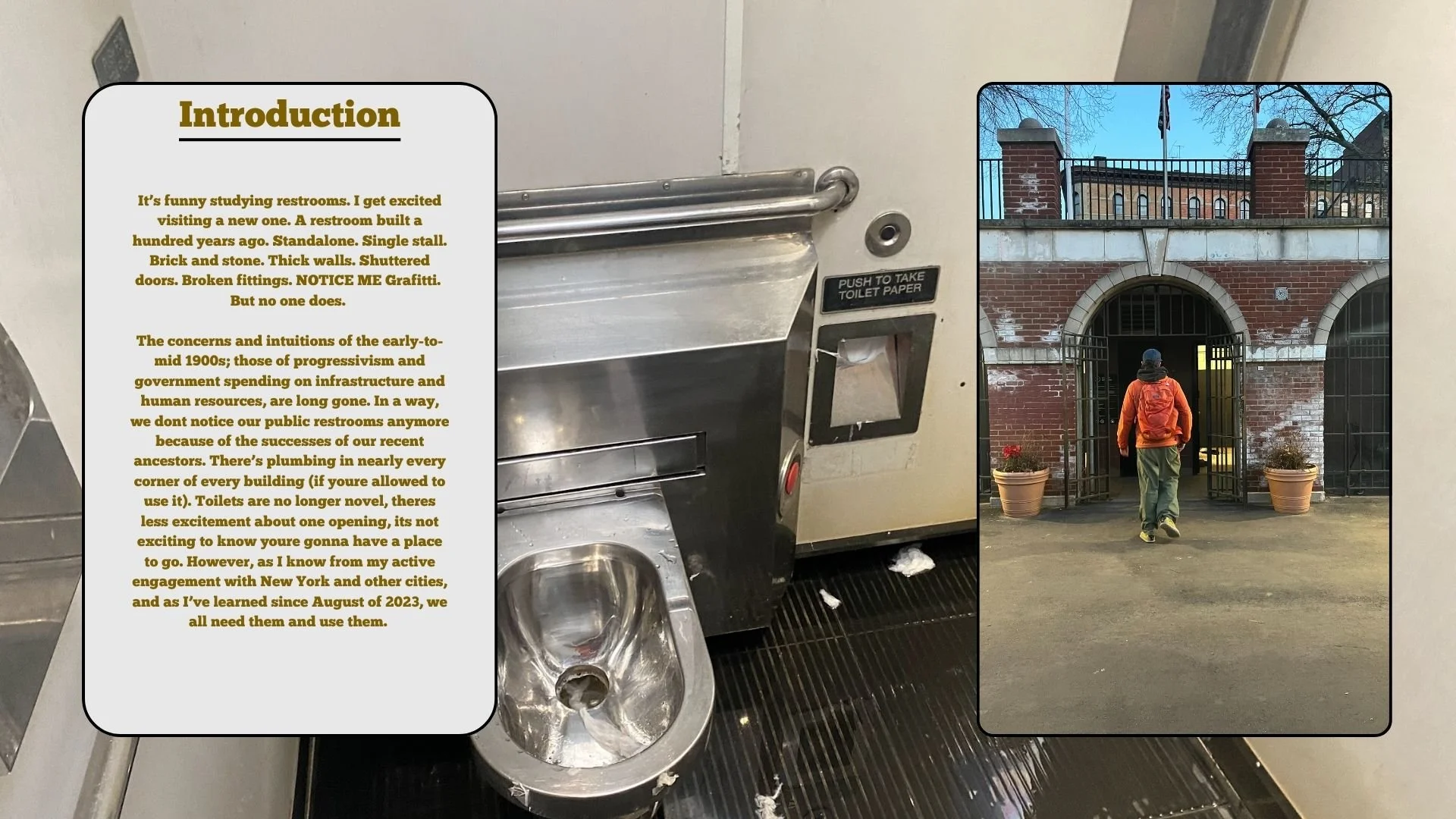in the summer of 2023 I was fortunate to find a job focused, in part, on public restrooms. this was just two weeks after seeing an episode on public restrooms in hbo’s “how to with john wilson” and while selecting my thesis topic. i havent stopped thinking about public restrooms since.
