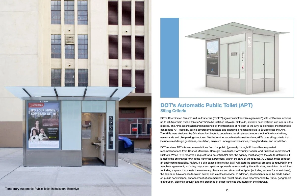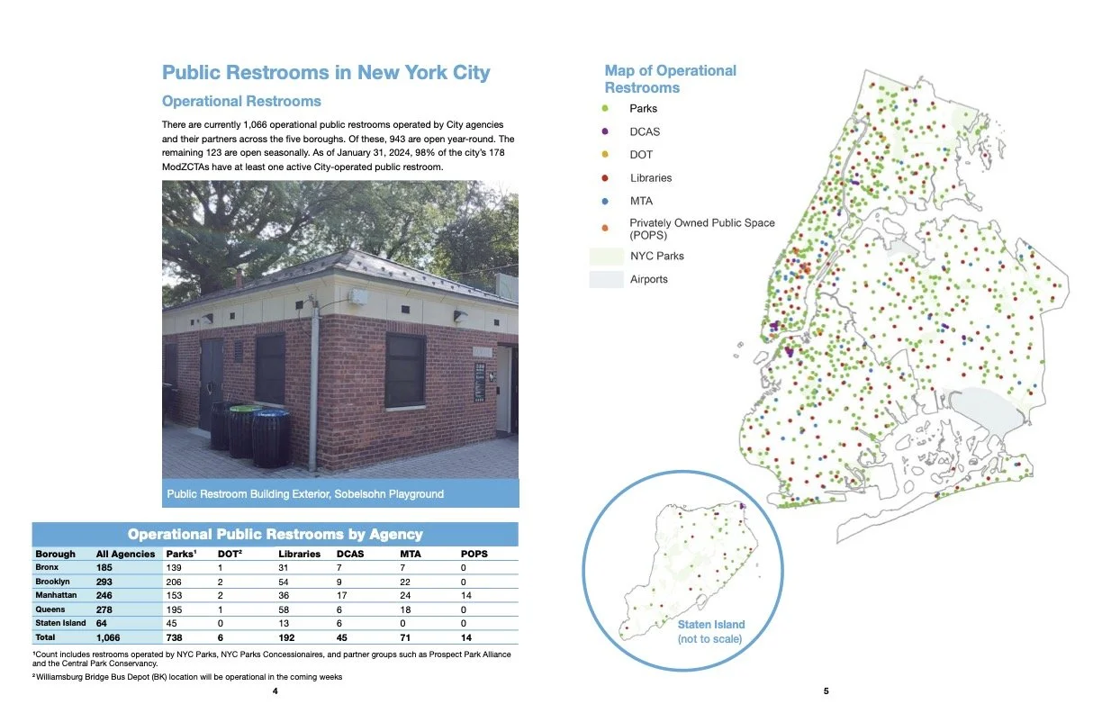 collaborated with nyc parks, mayor’s office, dcas, mta, nypl, bpl, qpl and others on a report documenting current and future restrooms in nyc. contributed dot data, handled coordination between agencies and stakeholders and ensured project delivery to the city council.